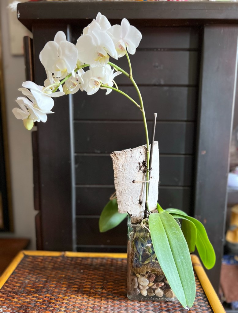 Our Orchids are Moth Orchids or Phalaenopsis amabilis, and what we’ve done is placed them in a glass container, with rocks on the bottom, and we used sphagnum moss as a substrate. We use rain water and we let the container completely dry out before watering again. We use a fish and kelp fertilizer only once a year after the flower stem has died. Every two years you can use new sphagnum moss as a substrate but we recommend keeping as much moss on the root system as possible and then adding new. You want to keep the Orchid in a warm place where there are no drafts and in indirect sunlight. They will flower for over a month if kept in the proper environment. If and when they do drop their flowers be patient they should return again by the end of the summer. Feel free to contact us if you have any more questions.